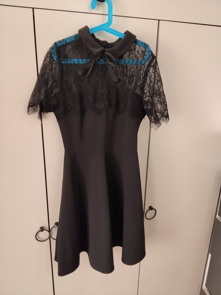 Siyah, dantel kısa kollu, yakalı ve fiyonklu mini elbise, romantik akşamlar için uygun.