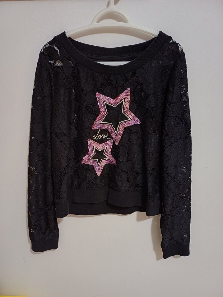Uzun kollu, yuvarlak yaka, dantel örme kumaşlı siyah kız sweatshirt. Nakışlı yıldız desenleri ve bol kesimi ile gotik, rock punk havası verir.