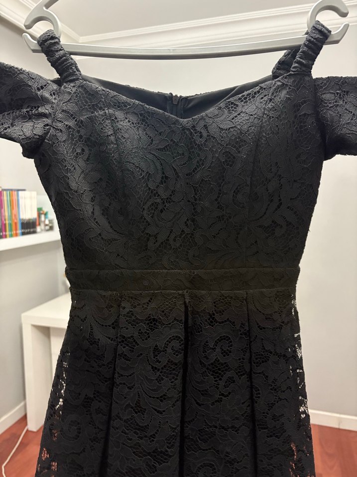 Dantel işlemeli kumaştan yapılmış, tekne yaka ve askılı kollu, siyah, uzun ve vücuda oturan gotik tarzda abiye elbise. Düğün için uygun, klasik şıklık sunar. Dar kalıp 36 bedene de oluyor