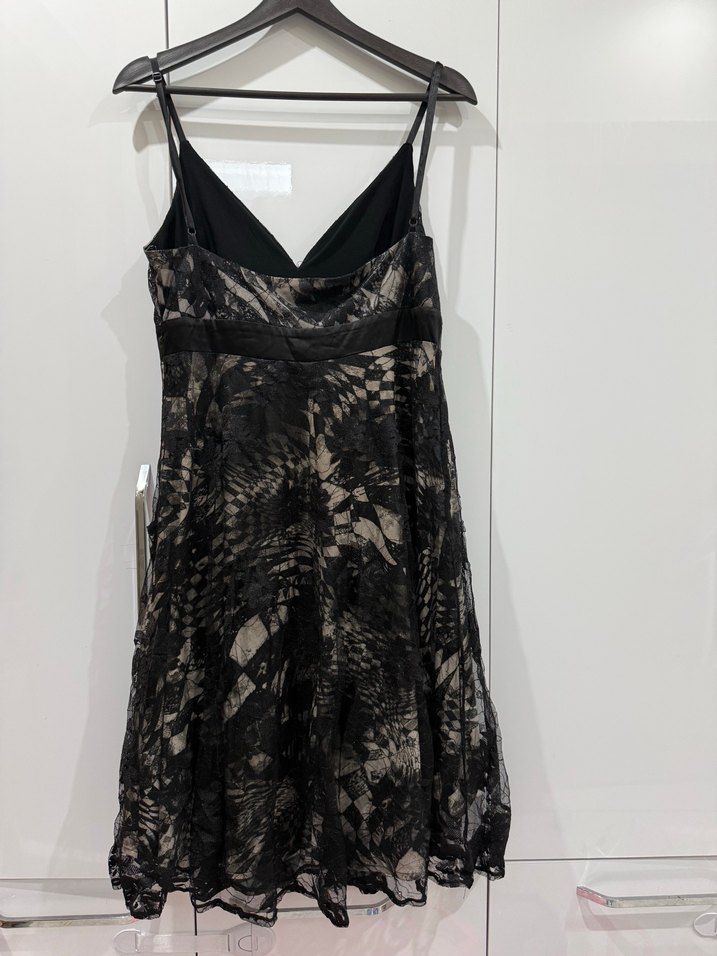 Dantel detaylı, siyah renkli, straplez yakalı ve midi boyda, fitted kesim abiye elbise. Koyu tie-dye desenleriyle gotik tarzı yansıtıyor. ✨