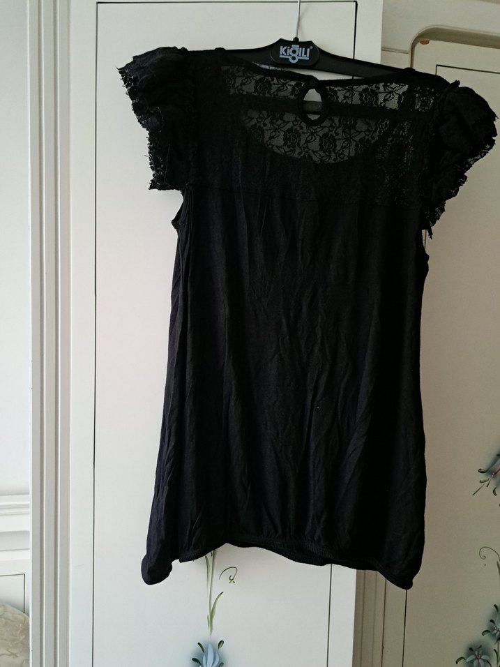 Yumuşak keten kumaştan yapılmış, kısa dantel kollu ve yuvarlak yakalı, bol kesim siyah midi bluz. Gotik ve bohem tarzıyla romantik akşamlar için uygun. (ön kısmında küçük bir lekesi var)