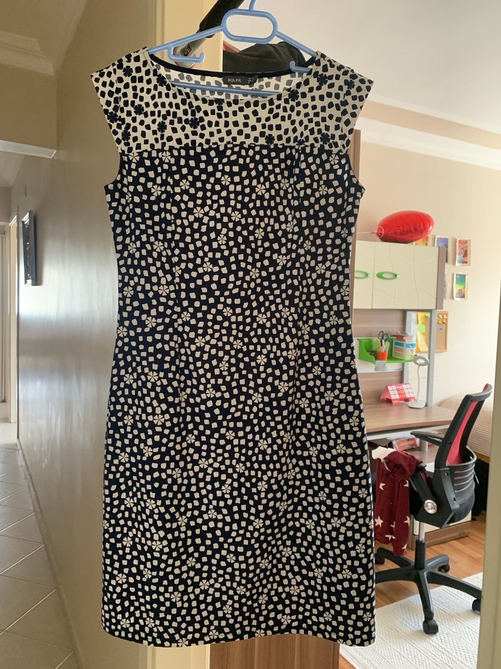 Larcivert renk, dantel detaylı ve baskılı desene sahip, kolsuz ve midi elbise. Hiç giyilmemiş