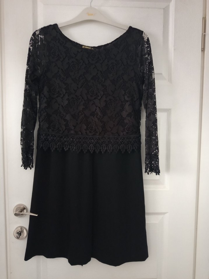 Dantel uzun kollu, bisiklet yaka ve siyah renkli, klasik zarafetle gotik tarzı birleştiren vücuda oturan midi elbise. Romantik akşamlar için uygun.