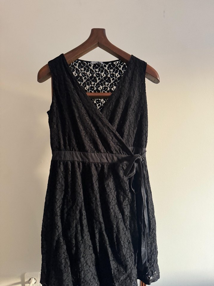 Dantel kumaştan, kolsuz ve V yaka tasarımlı, klasik şıklık ve vintage gotik tarzını birleştiren siyah midi elbise.