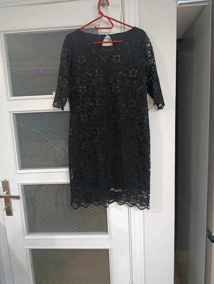 Siyah dantel midi elbise, kısa kollu ve yuvarlak yakalıdır. Gevşek kesimi ve gotik Paris tarzıyla romantik akşamlar için uygundur. fakir kol kol boyu 38cm dir.elbise boyu 100cm dir.iki kol arası 51 cm dir 48 beden diyor ama ölçüler dikkate alın 44-46 beden uyumludur