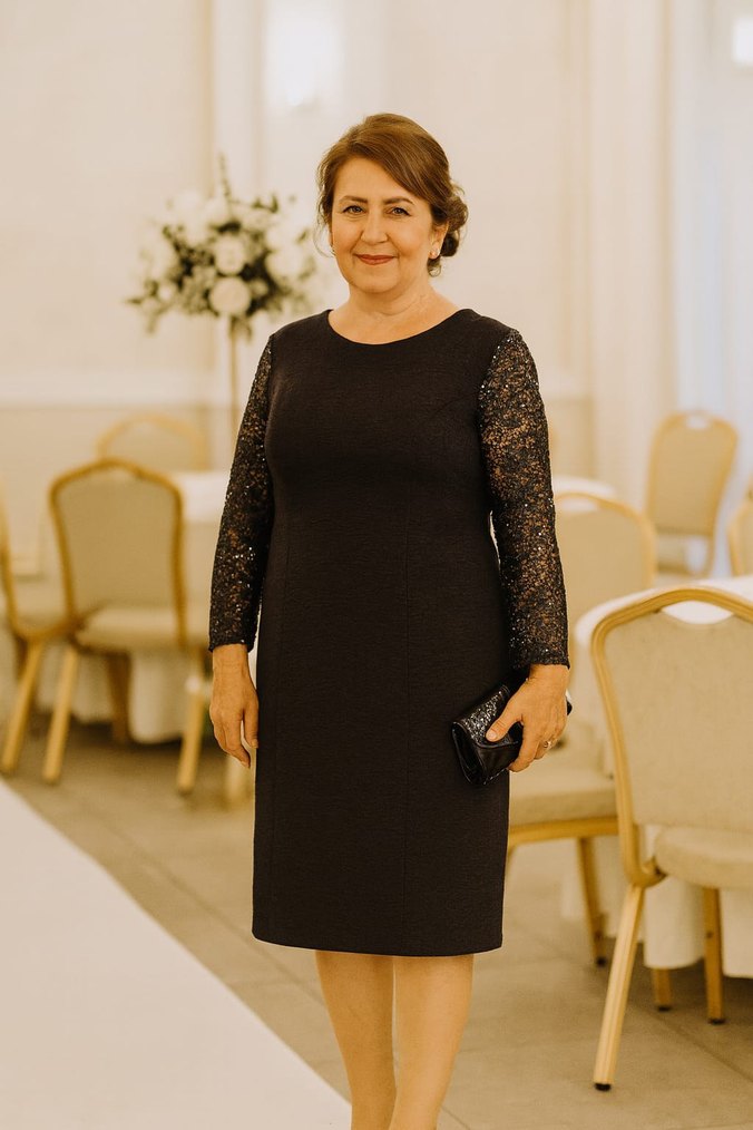 Uzun dantel kollu, V yakalı siyah midi elbise, modern klasik stilde ve ofis kullanımı için uygun regular fit kesime sahiptir.
