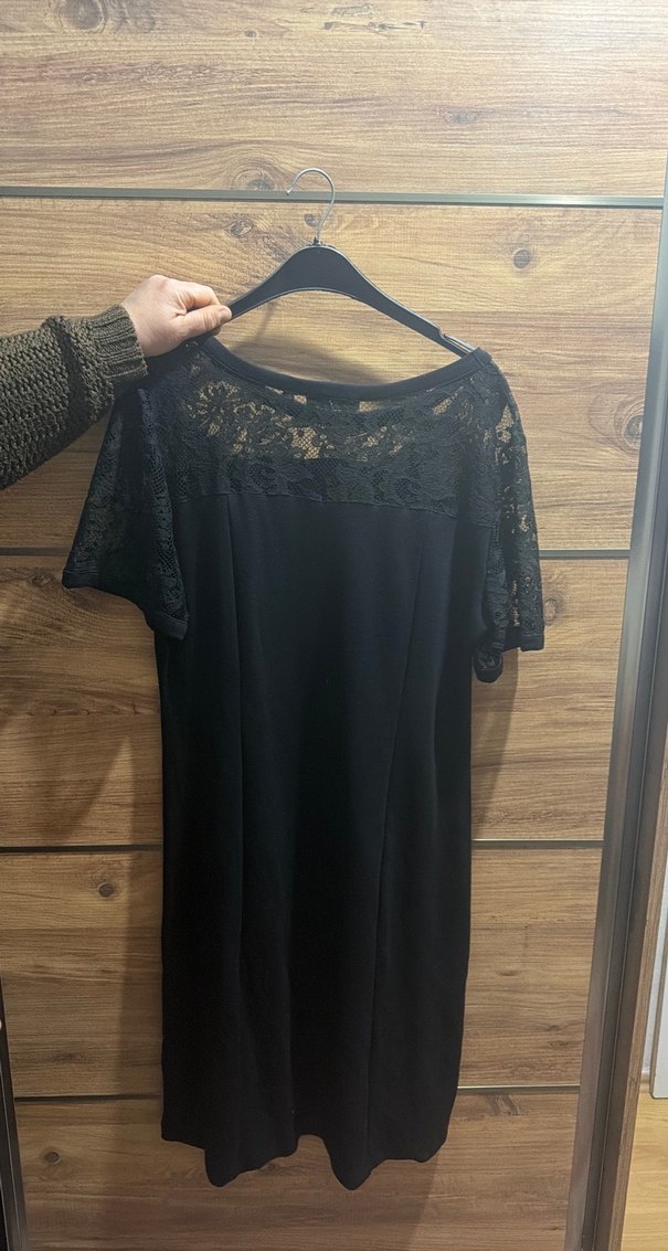 Kısa kollu, yuvarlak yakalı siyah midi elbise, üst kısmı ve kolları dantel detaylıdır. Trendy ve şık, romantik akşamlar için uygundur.