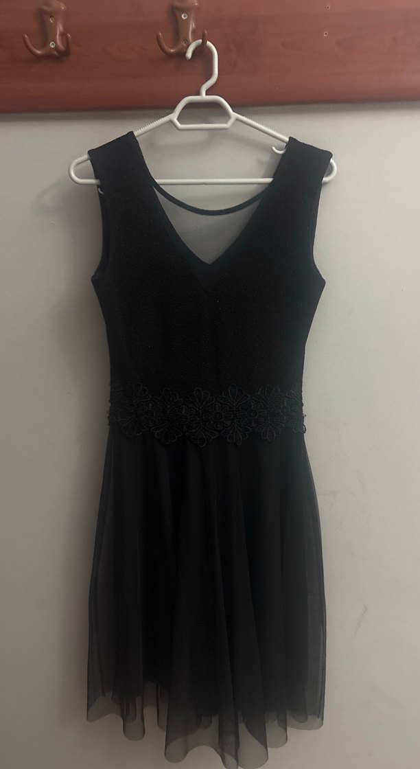 V yaka ve kolsuz tasarıma sahip, beli dantel detaylı siyah midi elbise. Klasik gotik şıklık sunar. Düğünler için uygundur.