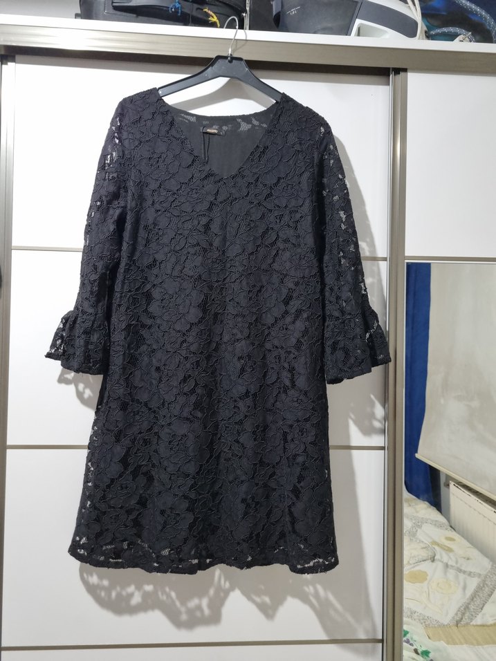 Uzun kollu, V yakalı siyah midi elbise, dantel detaylı ve bol kesimdir. gusto kalutesi ve farkını bilenlere hayırlı olsun