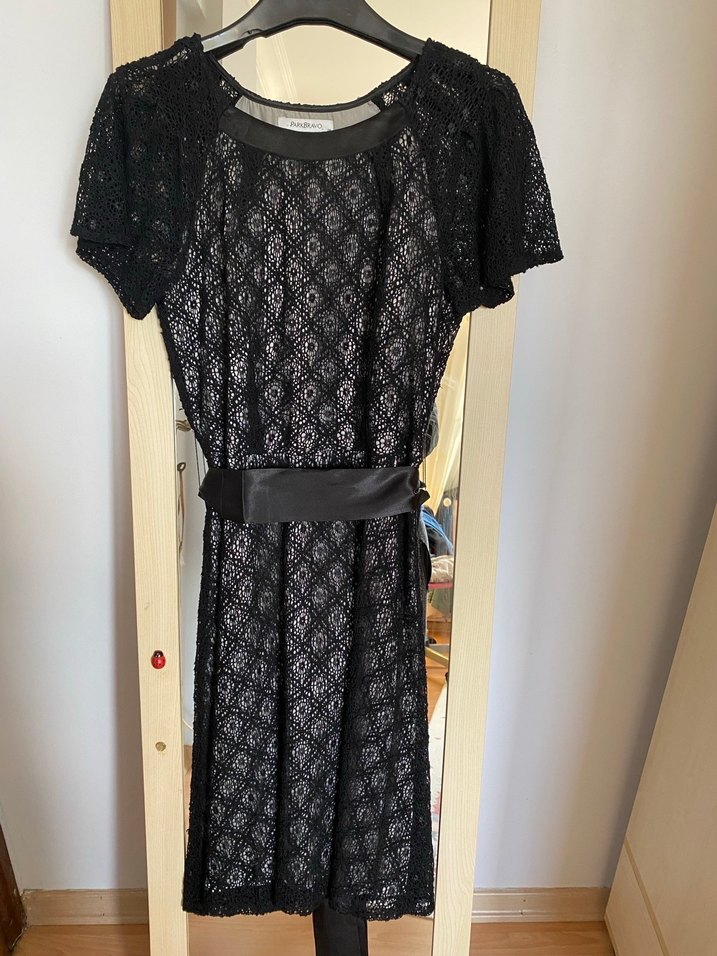 Dantel kumaş ve kısa kollara sahip, vücuda oturan siyah midi elbise. Gotik tarzda, klasik şıklık sunar. Romantik akşamlar için ideal. Orjinal marka gri astar sayılı kullanıldı kusursuz
