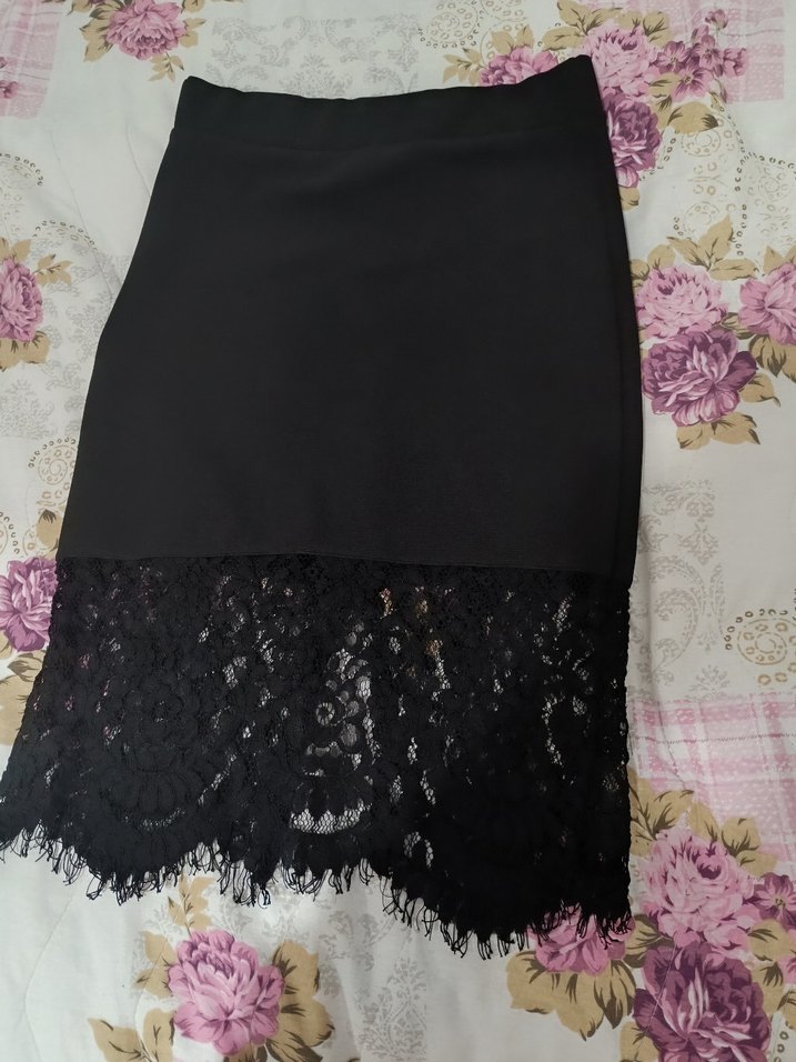 Dantel detaylı, siyah midi uzunlukta ve vücuda oturan etek.Gotik stil ve romantik dokunuş sunar, cesur bir görünüm için uygundur. tertemiz birkaç kez giyildi
