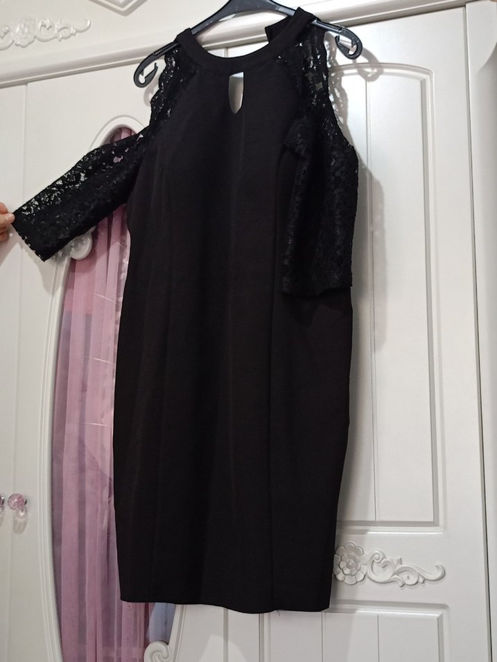 Dantel kollu, straplez yaka siyah midi gece elbisesi. Fitted kesim ve gotik tarzıyla romantik akşamlar için ideal.