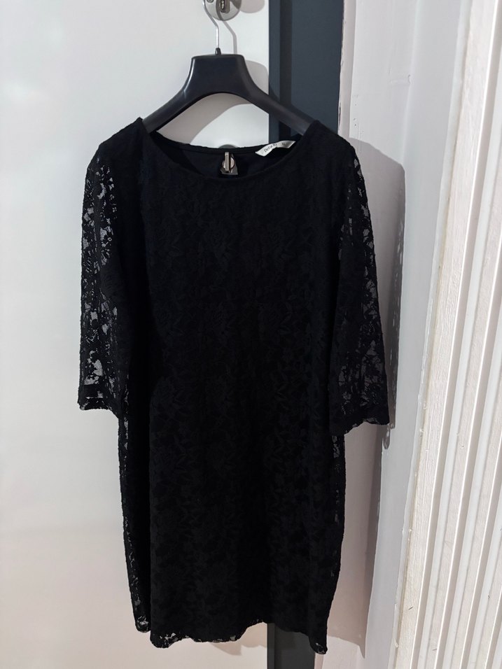 Siyah midi elbise, dantel kollu ve rahat kesimdir. Yuvarlak yakasıyla klasik gotik şıklığı yansıtır.