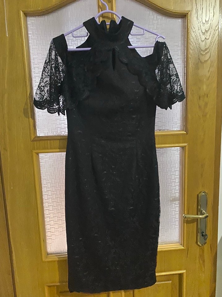 Dantel kısa kollu, yüksek yakalı siyah midi elbise, klasik gotik şıklığı yansıtır. Özel davetler ve düğünler için uygundur.