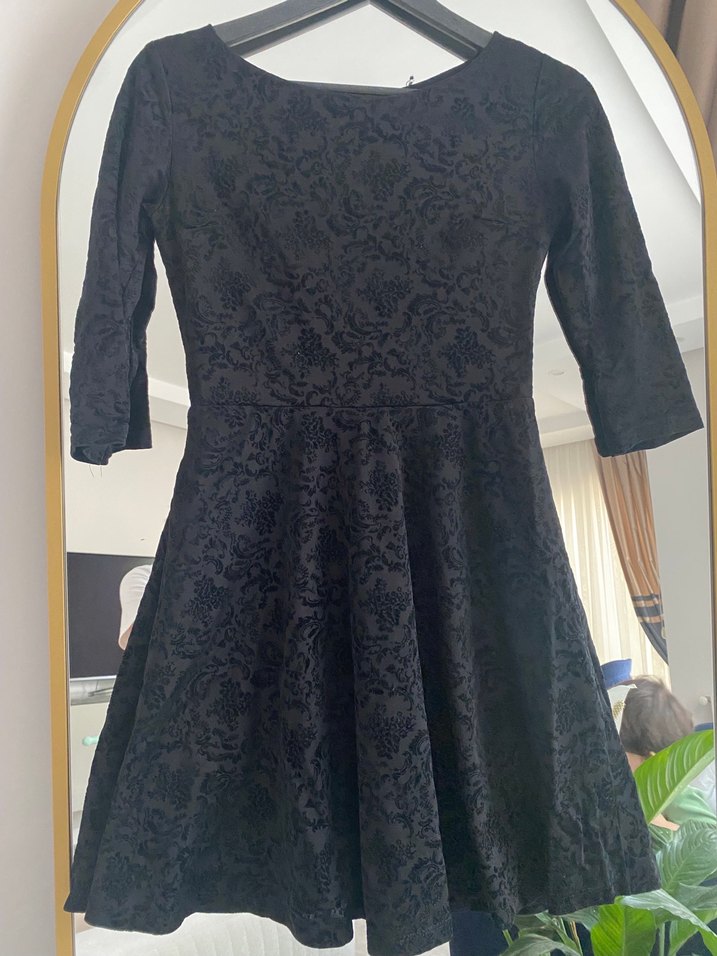 Siyah midi elbise, dantel desenli kumaş, uzun kollu ve V yakalıdır. Gotik ve klasik şıklığı bir arada sunar, ofis için uygundur.