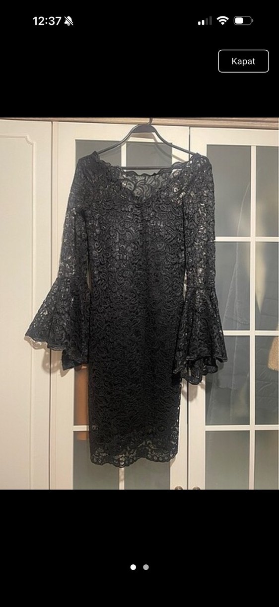 Bu siyah midi elbise, dantel desenleri, uzun ve geniş kolları ile klasik gotik şıklığı yansıtıyor. V yaka tasarımlıdır.