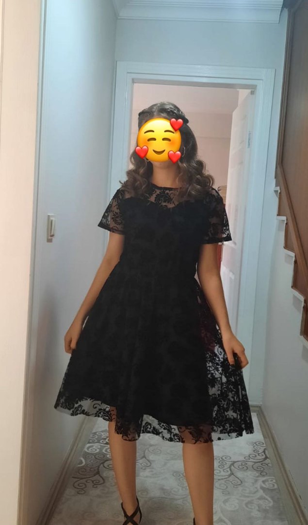 Kısa kollu, tek renk siyah midi elbise, dantel detayları ve tekne yaka ile gotik tarzda cesur bir görünüm sunar.kalıbı dar..