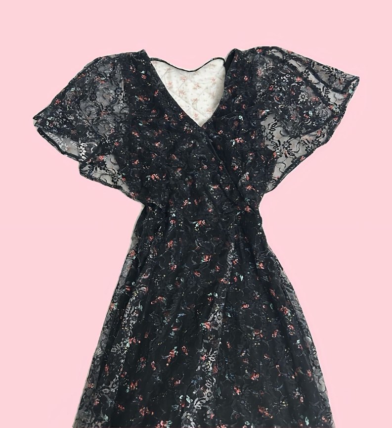 Siyah midi elbise, V yakalı ve çiçek desenli dantel detaylıdır. Bol kesimi ve askılı kolları ile gotik tarzı yansıtır.