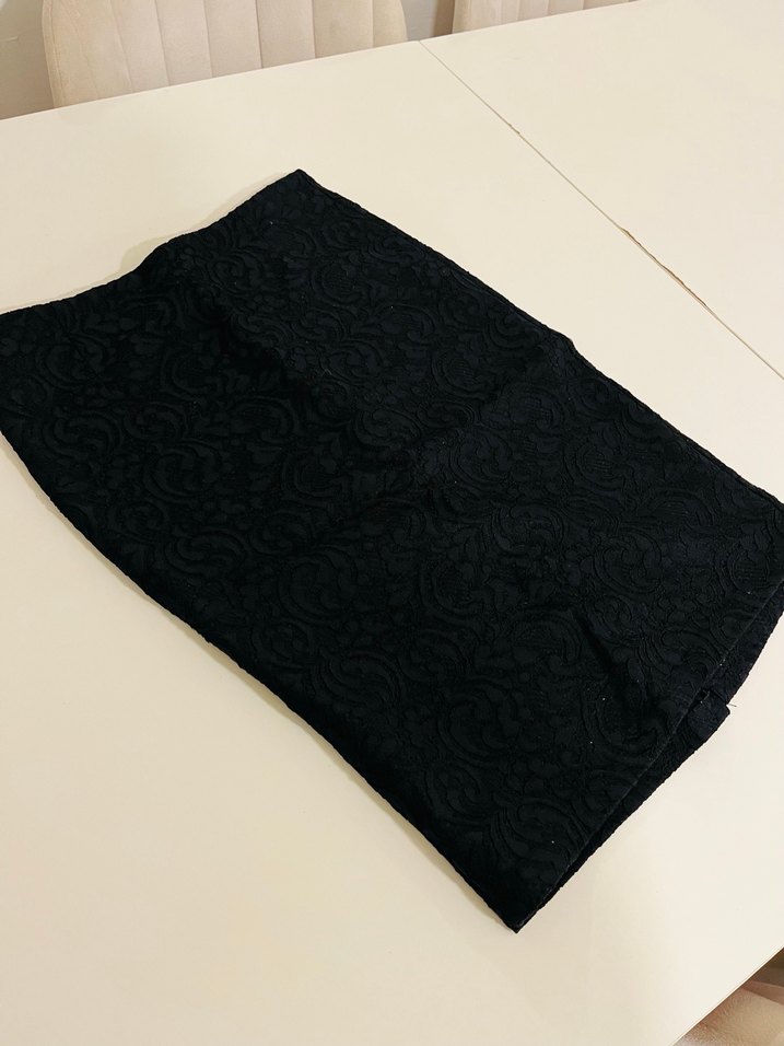 Dantel detaylı, siyah renkli, midi boyda ve vücuda oturan kalem etek, ofis ortamına uygun minimalist gotik tarzda, yumuşak sentetik kumaştan.