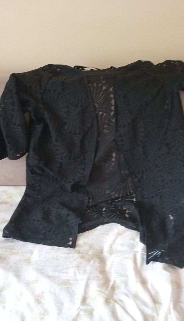 Dantel detaylı, kısa kollu, V yakalı siyah midi kimono. Gevşek kesimi ve gotik tarzıyla günlük kullanıma uygundur. sıyah kupurlu hırka mayo ustıune normale de gıyılır.