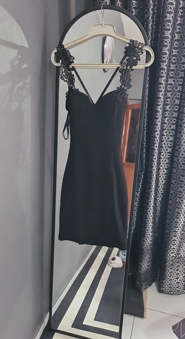Siyah, v yaka, dantel detaylı askılı midi elbise, gövdeyi saran kesimiyle gotik ve cesur bir tarz sunar.