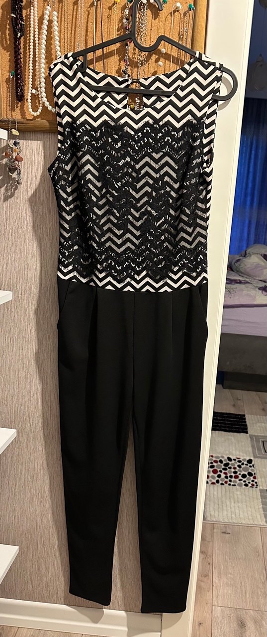 Dantel detaylı, desenli üst kısmı ve düz alt kısmı olan, v yaka ve kolsuz siyah midi tulum. Ofis için uygun şık bir tercih.