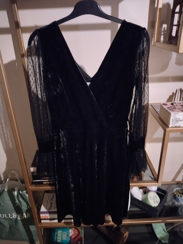 Bu siyah midi elbise, V yaka ve dantel detaylı ince askılı kollarıyla klasik gotik stile uygun, vücuda oturan bir kesime sahiptir.