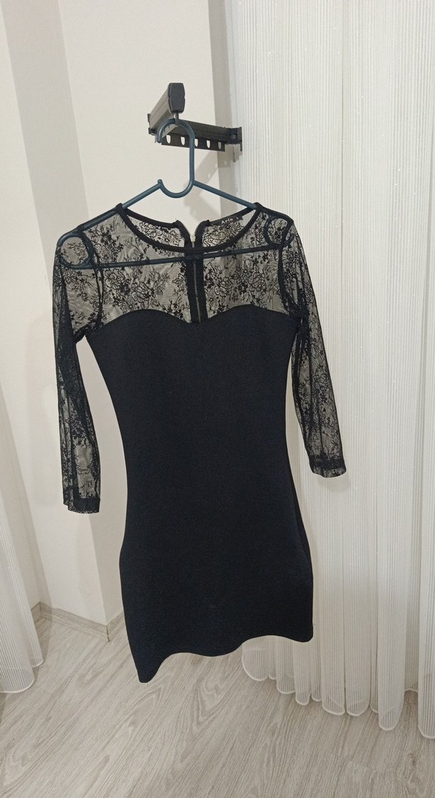 Dantel uzun kollu, V yaka, siyah midi elbise. Üst kısmı ve kolları şeffaf dantel detaylı, gothic tarzda, romantik akşamlar için uygun.