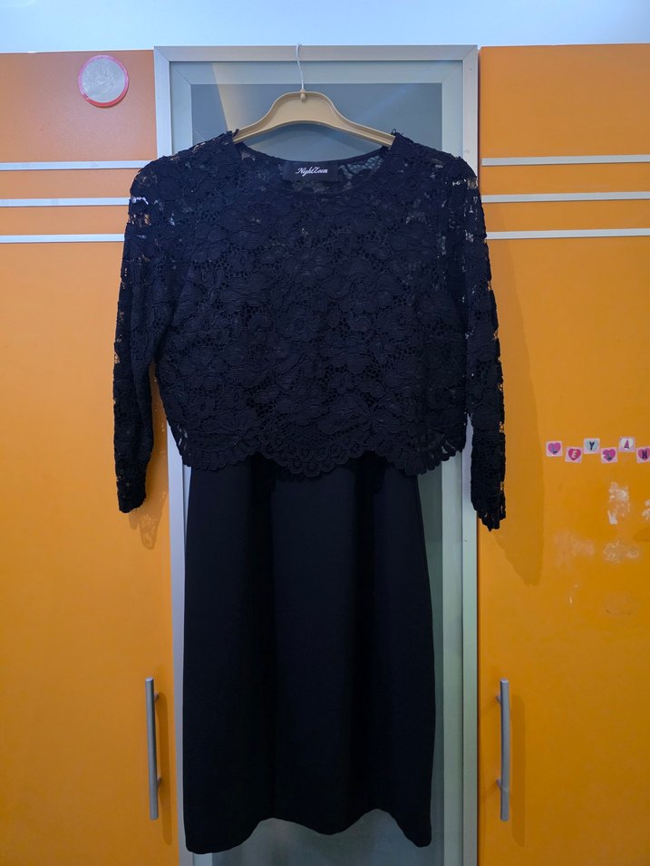 Dantel detaylı uzun kollu, siyah mini abiye elbise. üzülerek dar geldiği için satışta 1 kez giydim üstü ve elbise ayrı ayrı kullanılabilir birbirinden ayrı parçalardır