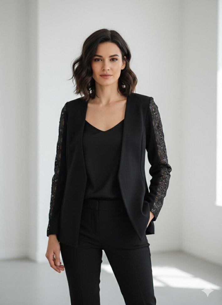 Dantel detaylı uzun kollu siyah mini blazer, saten dokulu kumaştan ve keskin yaka ile ofis şıklığı sunar.