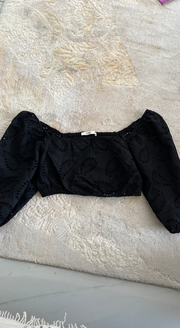 Siyah, uzun kollu, tekne yaka, dantel işlemeli ve vücuda oturan mini bluz. Minimalist ve bohem tarzlar için uygun.