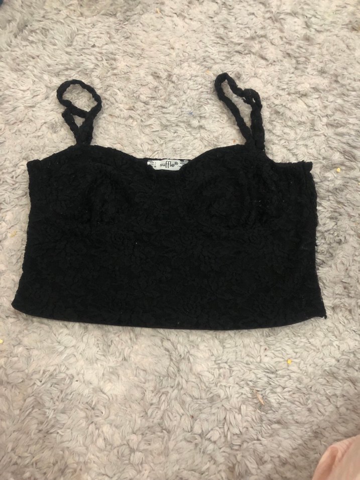 Dantel detaylı, ince askılı, siyah mini büstiyer. Fitted kesim ve rahat goth tarzıyla günlük kullanıma uygun. Marka temsili