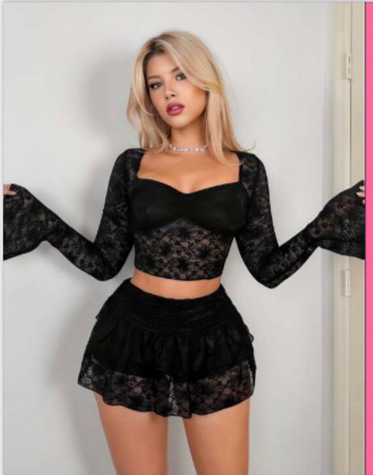 Dantel detaylı uzun kollu, straplez yakalı siyah mini elbise. Sentetik kumaştan, vücuda oturan kesimle gotik tarzda cesur bir seçim.