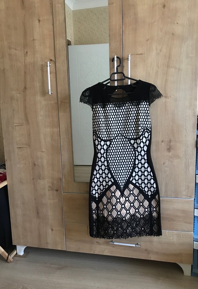 Dantel detaylı, straplez yaka ve askılı kollara sahip, baskılı desenli siyah mini elbise. Gotik tarzda, vücuda oturan kesim. UZUNLUĞU 89 CM