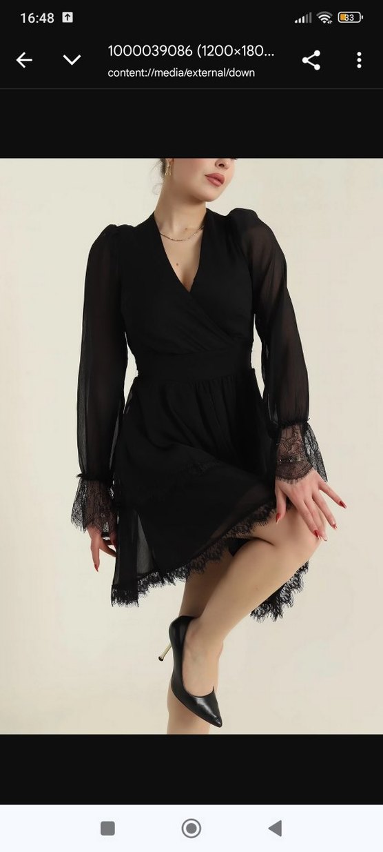 Siyah, dantel detaylı, mini boy, ince kesim, ipeksi kumaş, uzun tüllü kollar ve V yakalı gotik tarz elbise.