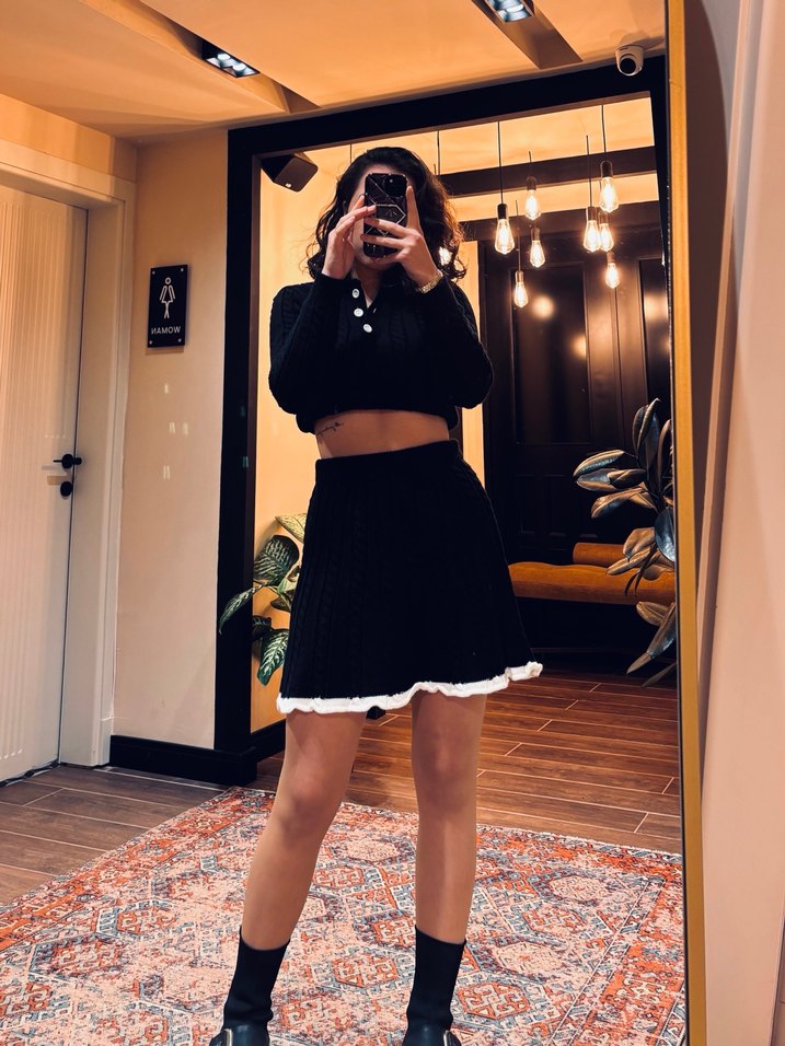Yumuşak triko kumaştan yapılmış, dantel detaylı siyah mini etek. Günlük kullanım için uygun, trend gotik tarzına uyum sağlar.