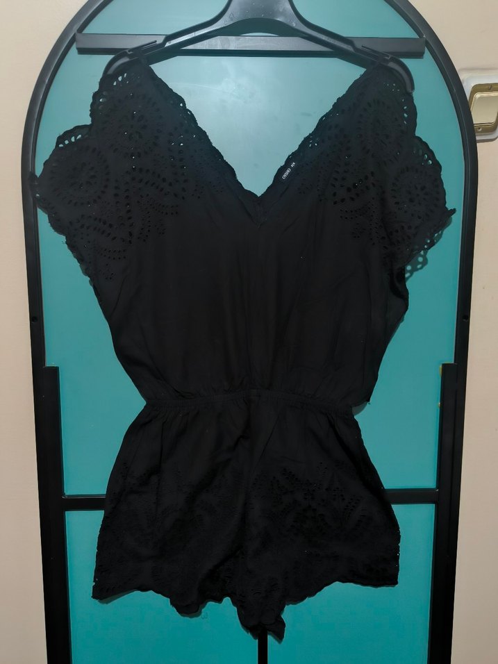 Siyah mini tulum, V yaka ve dantel nakışlı detaylara sahiptir. Askılı kollu, bol kesim ve bohem gotik tarzındadır, romantik akşamlar için uygundur.
