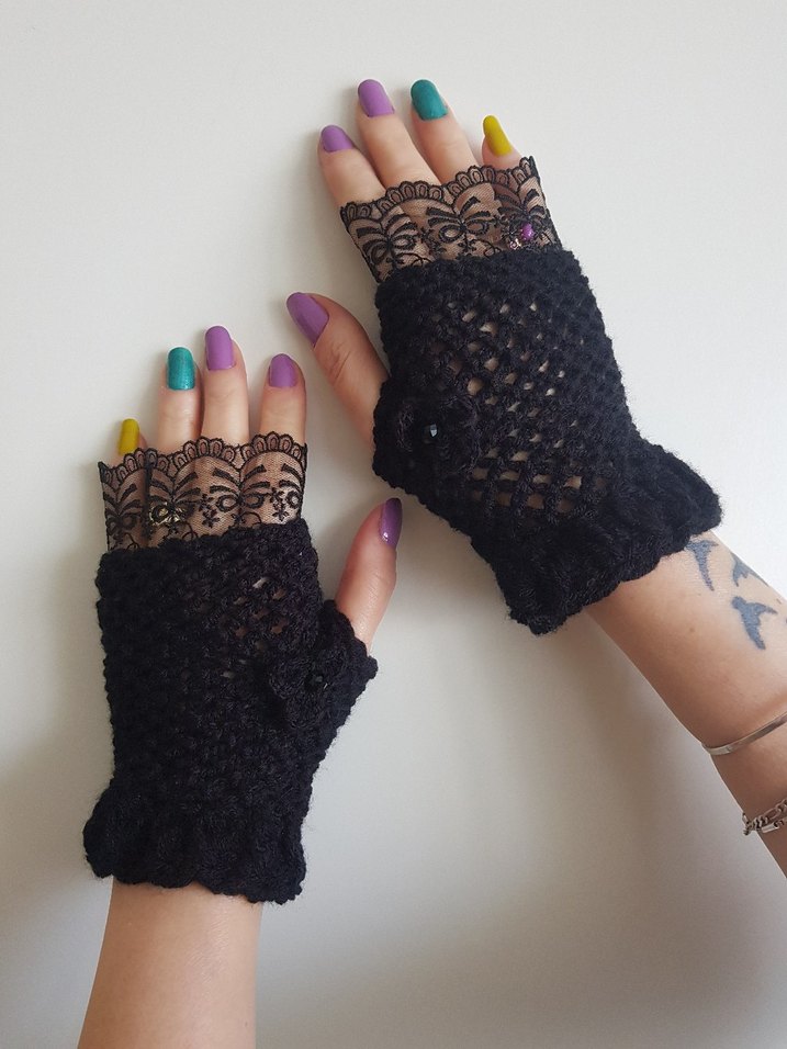 Dantel detaylı, parmaksız siyah örgü eldivenler. Bohem ve gotik tarzda, retro ve hippie görünüm için uygun. Siyah dantelli file eldiven. Eldivenlerimizin tamamı el örgüsü ve özel tasarımdır. Sıfır üründür. Rengarenk, cıvıl cıvıl, neşeli eldivenlerim, kışın içinizi ve gönlünüzü ısıtacak. Sıfır üründür. Bedeni standarttır. Eldiven çeşitlerim ve ürün yelpazem oldukça geniştir. Lütfen mağazamı ziyaret edip ürünlerimi inceleyin.