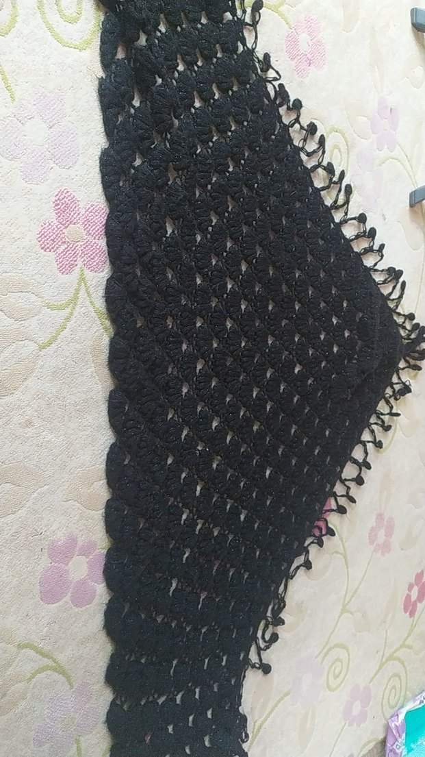 Siyah örgüden yapılmış, dantel detaylı kadın şalı. Gotik ve bohem tarzı bir arada sunar, yumuşak dokulu ve retro görünümlü.
