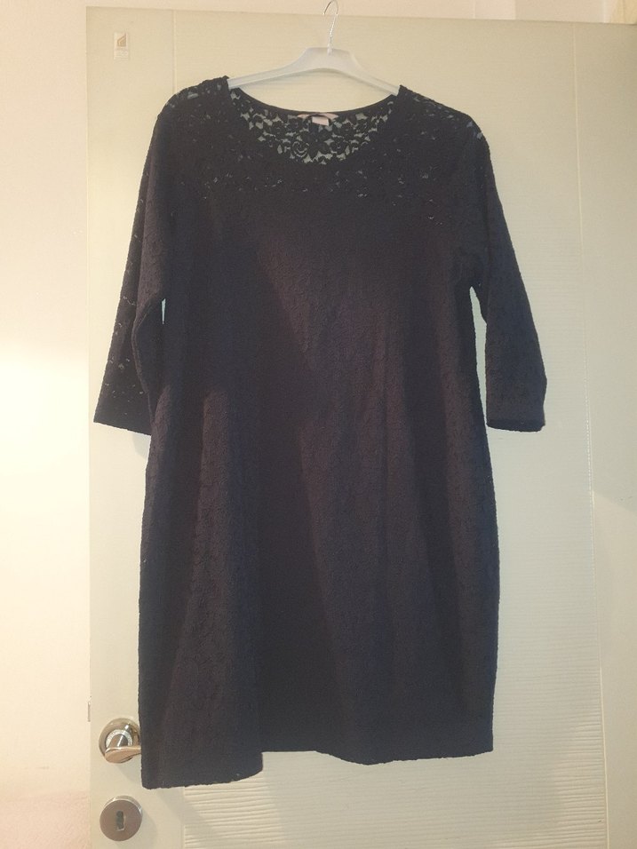Siyah örme midi elbise, bol kesim ve uzun kolludur. Yuvarlak yakada dantel detayları bulunur, rahat ve şık bir tercihtir.