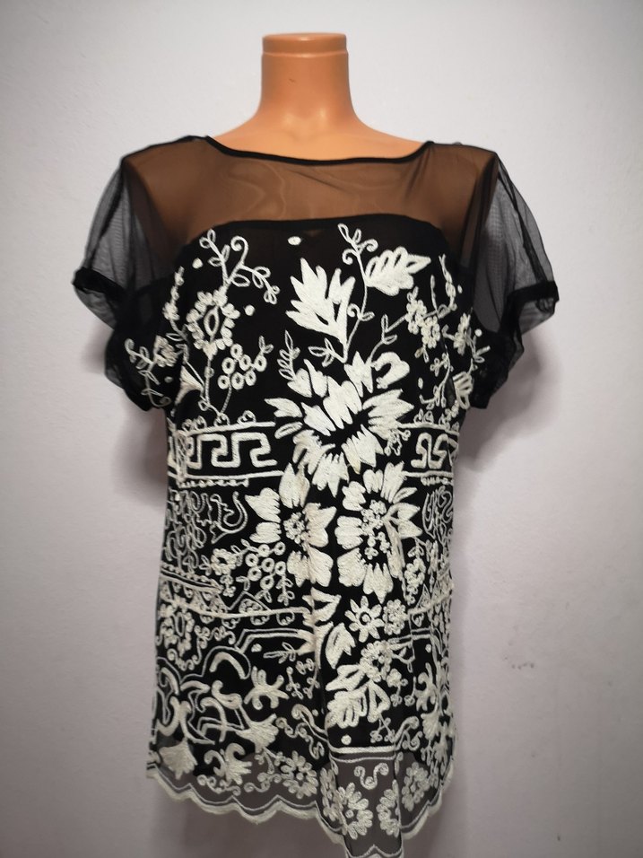 Siyah bohem tarzı kısa kollu, dantel detaylı ve kayık yaka bluz. Rahat kesim, kısa uzunluk ve beyaz çiçek desenleri içerir. 42.44 beden boyı 69cm iki kol arası 54cm