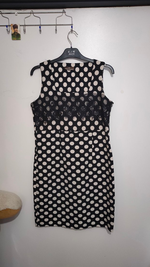 Siyah zemin üzerine beyaz puantiyeli, kolsuz kısa elbise. Dantel detaylı, fitted kesim ve yuvarlak yaka. Ofis için uygun vintage goth tarzı elbise.