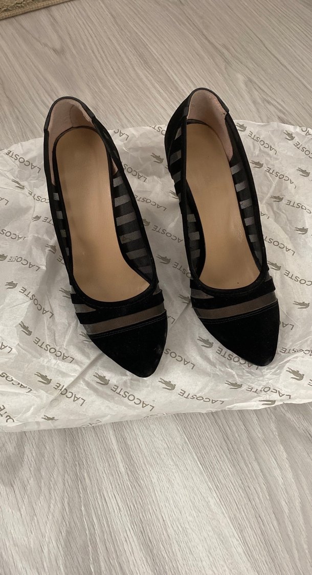 Siyah, dantel detaylı ve sivri burunlu topuklu stiletto ayakkabılar. Kauçuk malzemeden yapılmış, gotik tarzda ve klasik şıklık sunar. Ofis için uygundur.