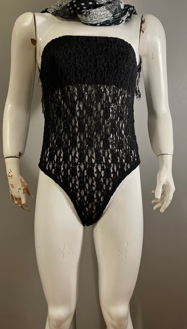 Dantel detaylı, siyah, straplez ve vücuda oturan bady avant-garde parti tarzına uygun.
