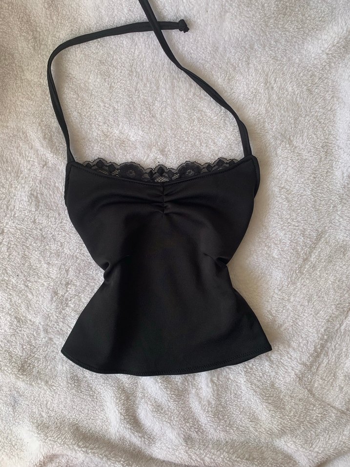Dantel detaylı, straplez yakalı ve vücuda oturan siyah bustiyer. Pürüzsüz sentetik kumaştan, cesur gotik stile uygun.