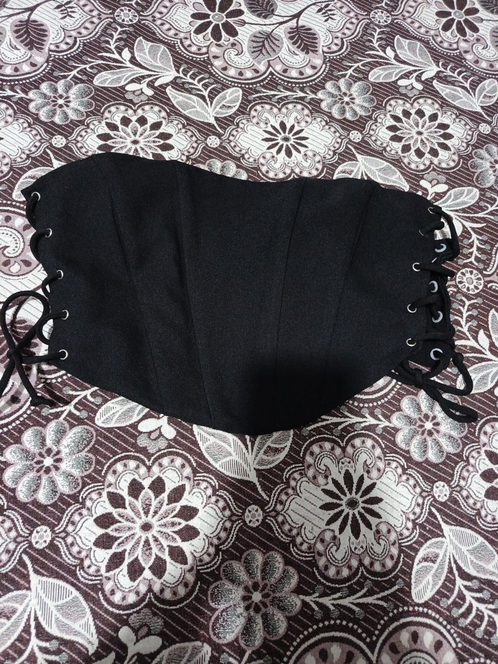 Siyah, dantel detaylı ve yanları bağcıklı straplez bustiyer. Sentetik kumaştan, nakışlı ve kısa kesim, gotik ve bohem tarzına uygun