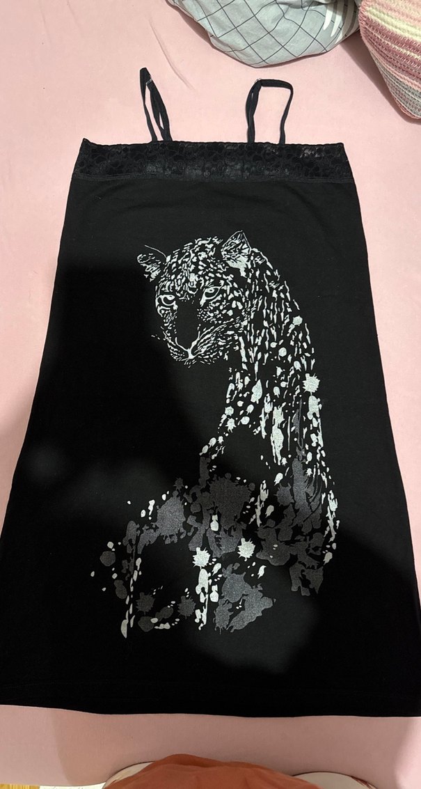 Dantel detaylı, straplez yakalı, baskılı leopar desenli siyah elbisesi. Uzun boylu, kolsuz ve dar kesim, yumuşak sentetik kumaştan üretilmiştir.