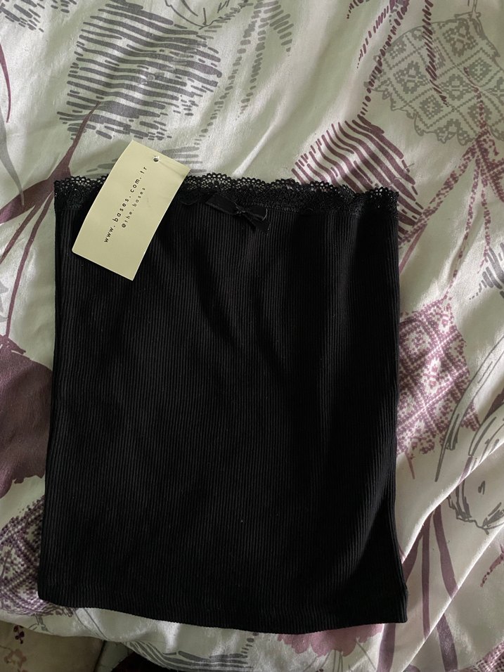 Dantel detaylı, straplez, siyah kadın bluz. Sentetik kumaştan, rahat ve gündelik sokak stili için uygun. Kolsuz ve midi boyda.