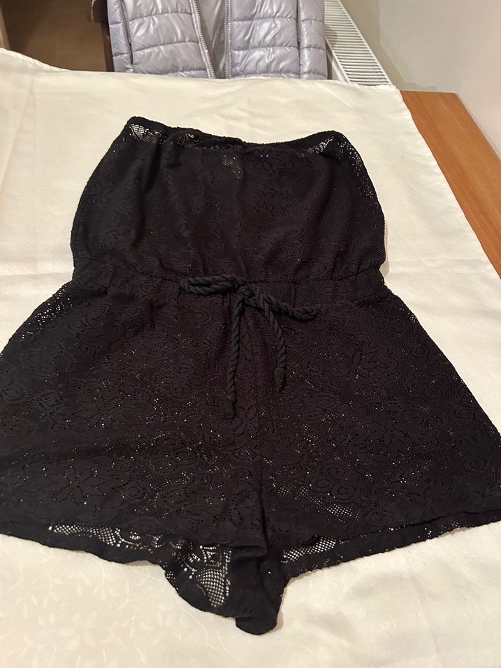 Yumuşak dantel kumaştan, dantel detaylı, siyah straplez mini tulum. Rahat kesimiyle romantik akşamlar için uygundur. Mayo üzerine giyilen göğüs kısmı lastiklidir ve ölçüsü 70cm dir hafif tülermesi var fotoğraflarda dikkat ederseniz görünüyor