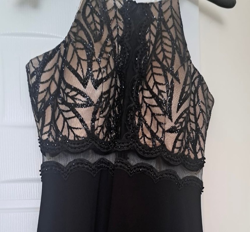 Halter yaka, dantel ve nakış detaylı, siyah uzun abiye elbise. Partiler için klasik şıklık sunar.